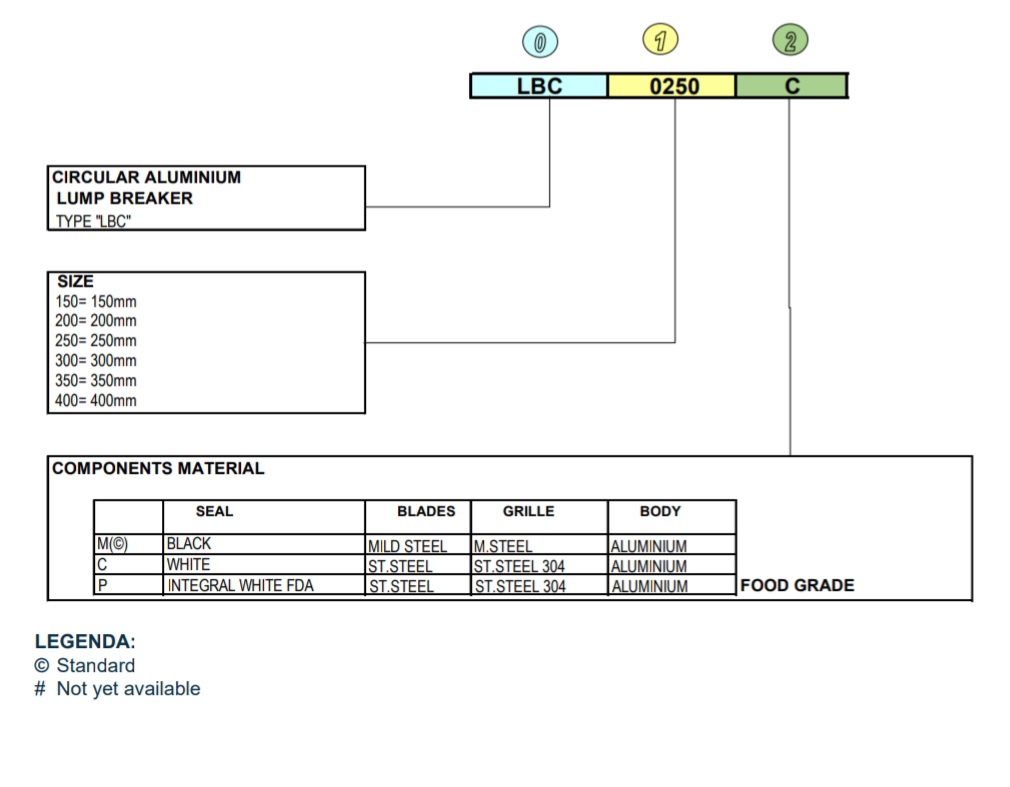 Rozdrabniacz LBC składa się z aluminiowego cylindrycznego korpusu z kołnierzem wlotowym i wylotowym, rusztu oraz zintegrowanego narzędzia do kruszenia napędzanego przez umieszczony z boku silnik elektryczny. Aby dostosować się do wymaganego rozmiaru cząstek, zarówno ostrza, jak i ruszt można łatwo zdemontować, aby dostosować je do pożądanych właściwości materiału. LBC służy do rozdrabniania materiałów sypkich, które mają skłonność do zbrylania się, podczas przetwarzania lub przechowywania (np. cukier, sól, krzemiany, chemikalia i żywność. Obrotowy rozdrabniacz LBC jest najczęściej montowany w rurach załadowczych/rozładunkowych, do opróżniania lub napełniania zbiorników, pojemników lub przenośników ślimakowych. Dostępny w wersji spożywczej.
