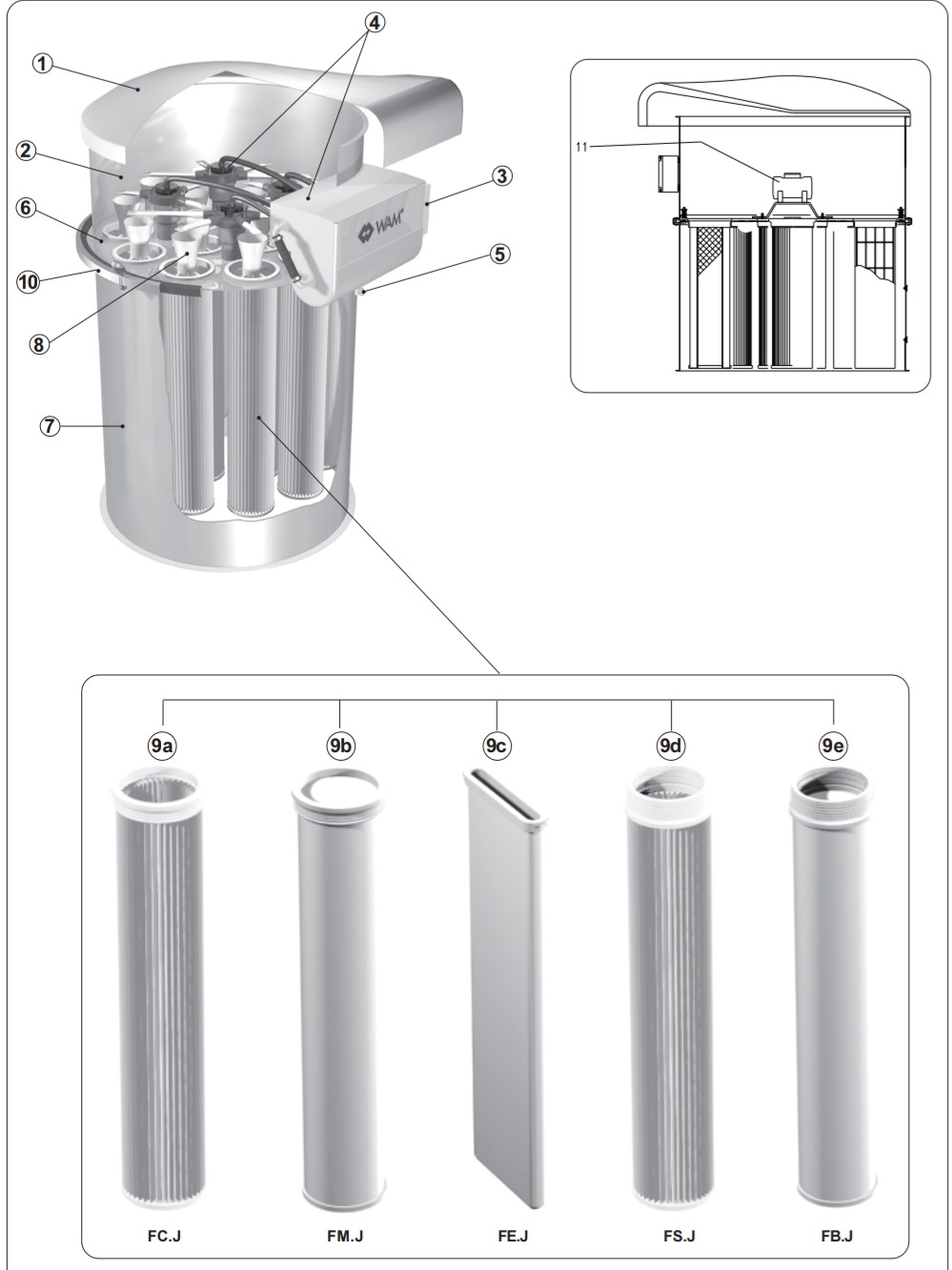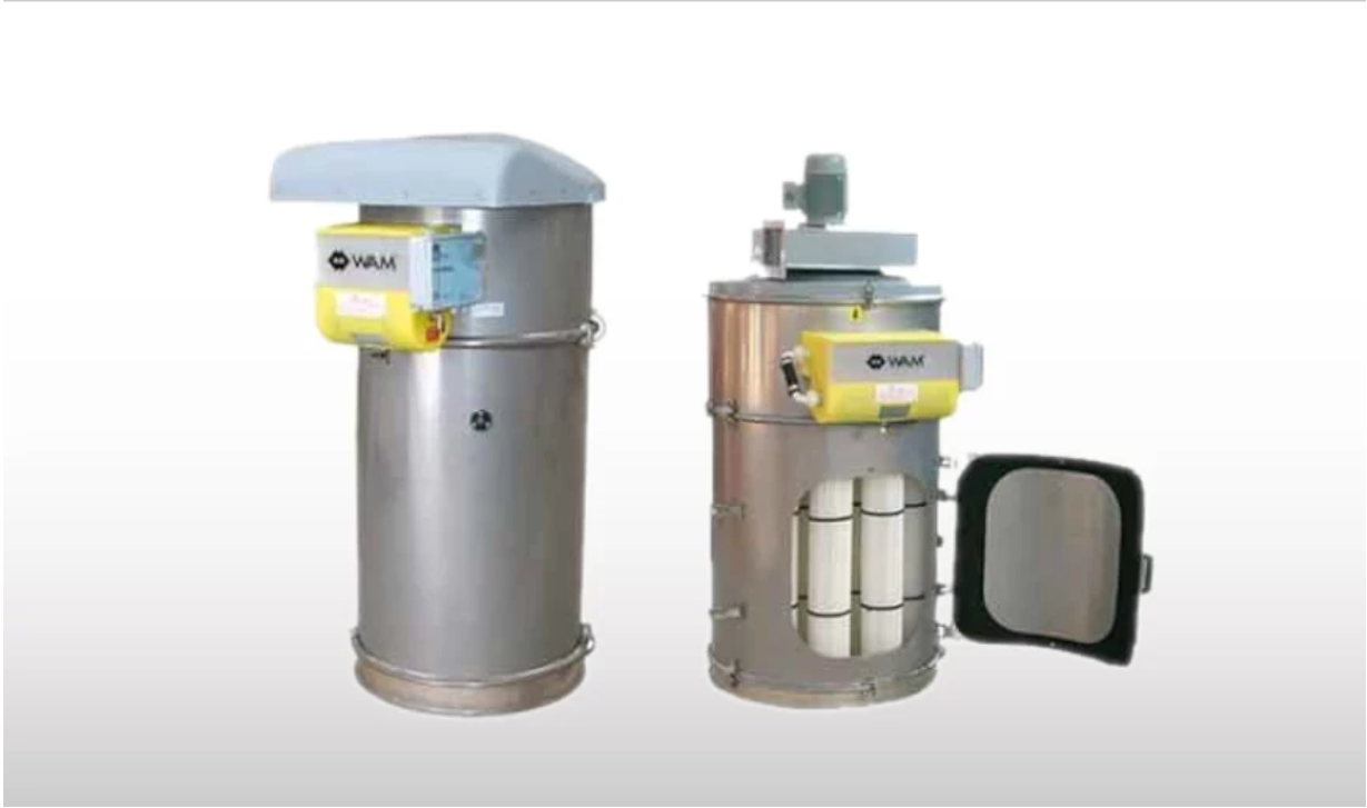 Filtry WAMECO zbudowane są z cylindrycznej obudowy ze stali nierdzewnej, poziomo włożonych elementów filtra i automatycznego systemu oczyszczania dyszami powietrza zwrotnego. Filtry WAMECO są wbudowywane w układy wentylacji lub jako samodzielne jednostki ze zbiornikiem na pył.
