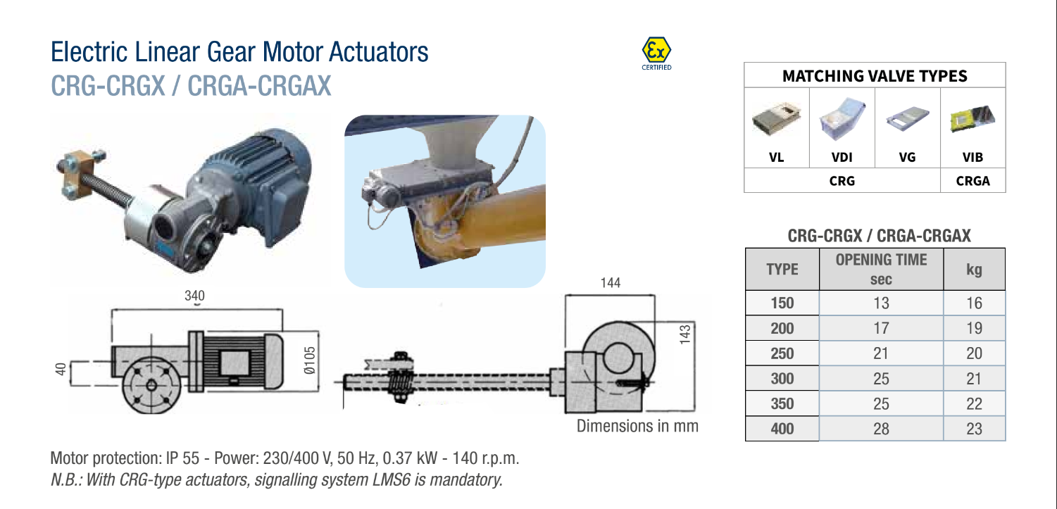 Napędy elektryczne typu CRG stosuje się do otwierania i zamykania zasuw nożowych typu VLQ, VLC, VLR i VDI. Motoreduktory CRG składają się z silnika elektrycznego i przekładni zębatej.